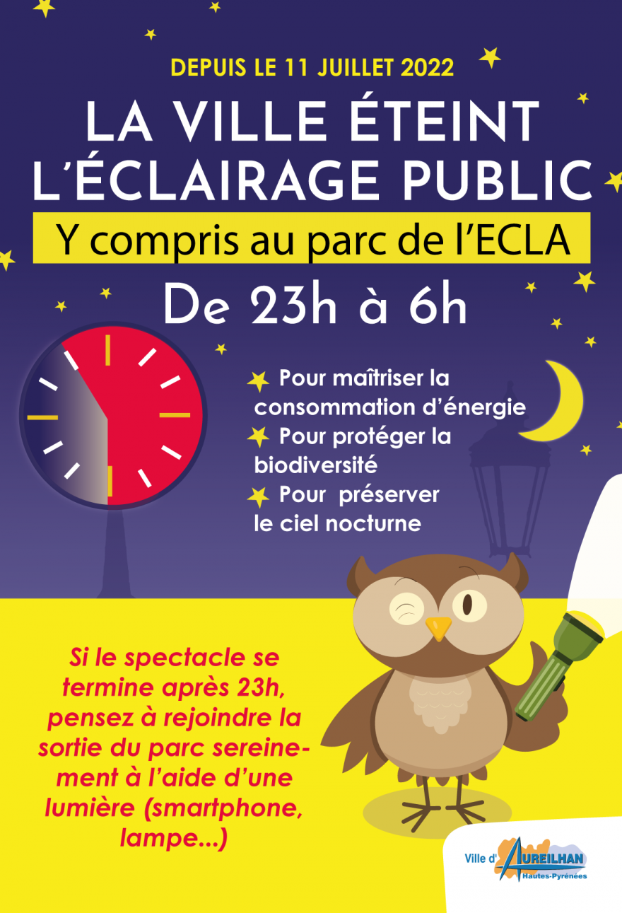 Les mêmes mesures d’extinction de l’éclairage s’appliquent dans le parc de l’ECLA. En conséquence, à la suite des spectacles se terminant après 23h, pensez à vous munir d’une lumière (smartphone, lampe…) pour rejoindre la sortie du parc sereinement.
